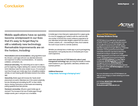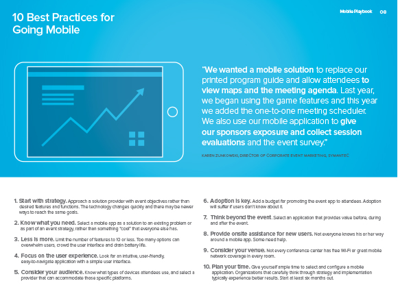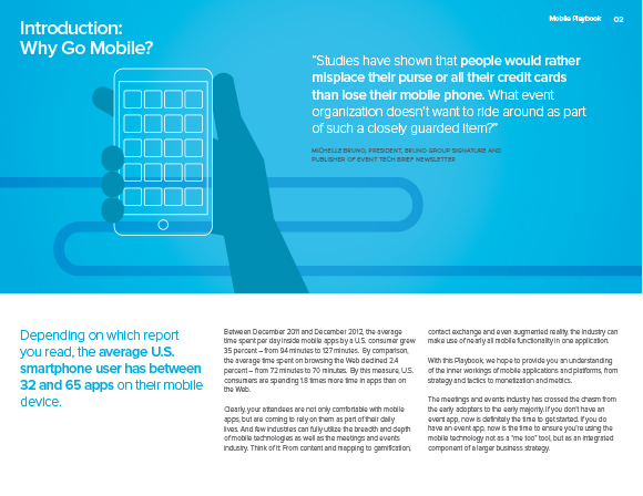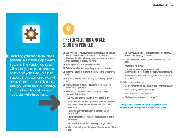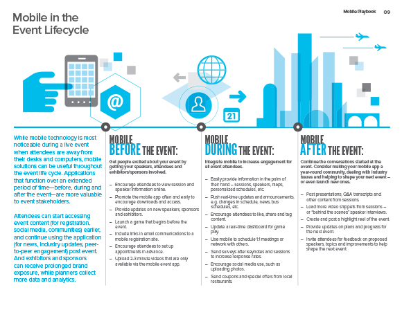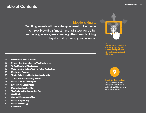 The Mobile Playbook was created as part of a three part series of “guidebooks”. This playbook is meant to serve as a guide to mobile event apps, through strategy, tactics and best practices. In the past outfitting events with mobile apps was a “nice-to-have”. Now it’s a “must-have” strategy for better managing events, empowering attendees, building loyalty and growing revenue.